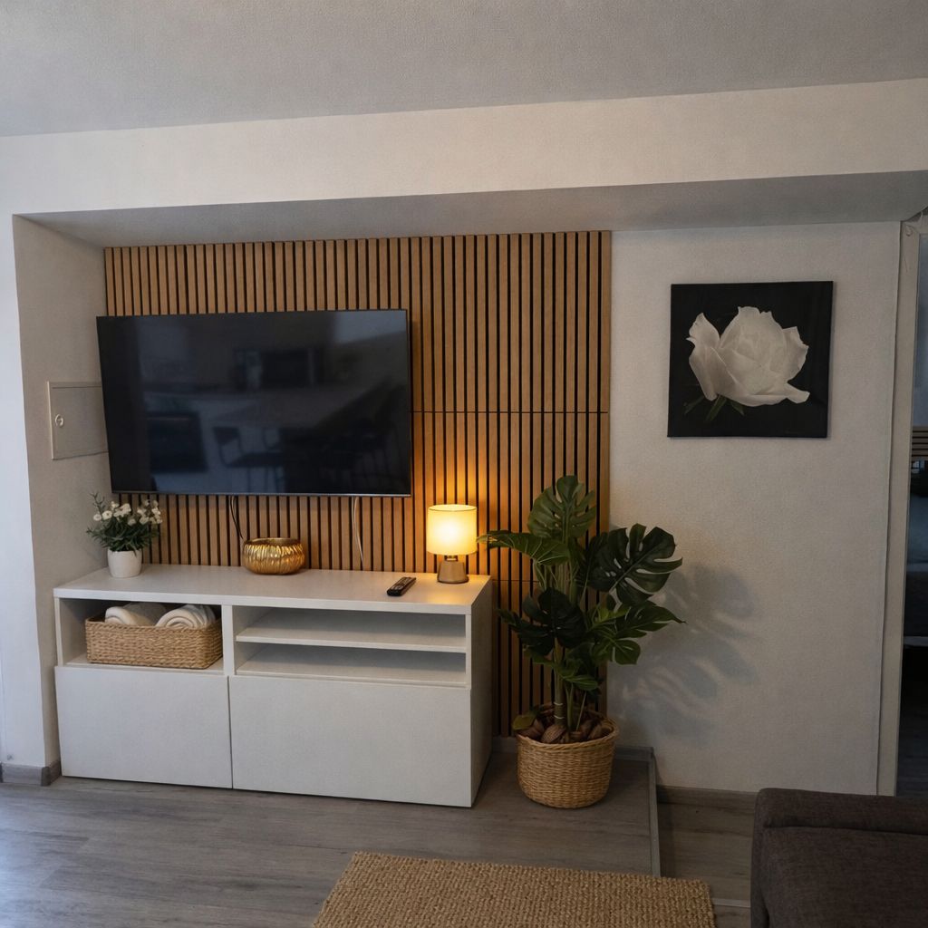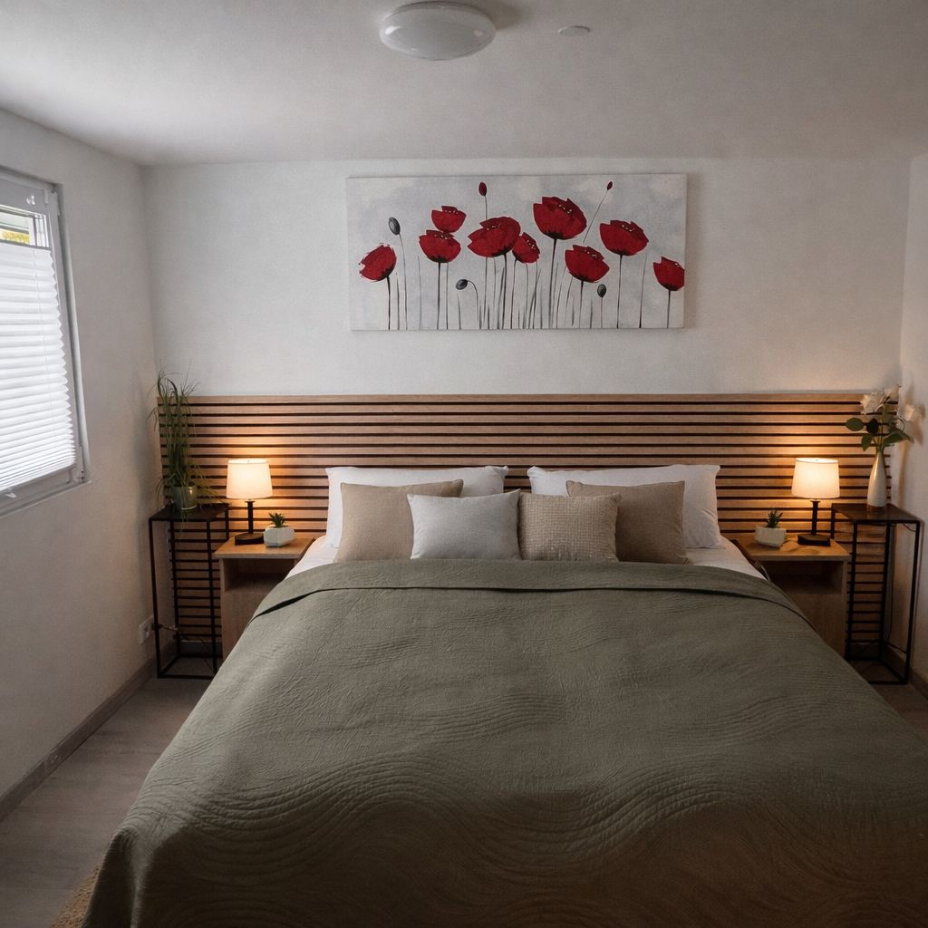 The spacious master bedroom impresses with a comfortable double bed (180 × 200 cm), which ensures restful nights. The tasteful furnishings with harmonious colors and lovely details create a calm and relaxed atmosphere.