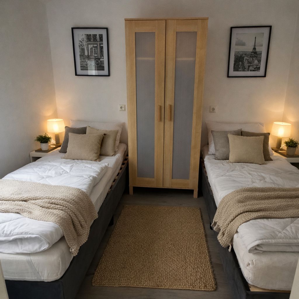 The second bedroom is ideal for children or additional guests and has two comfortable single beds (80 × 200 cm each). The friendly and bright design ensures a pleasant feel-good atmosphere.
