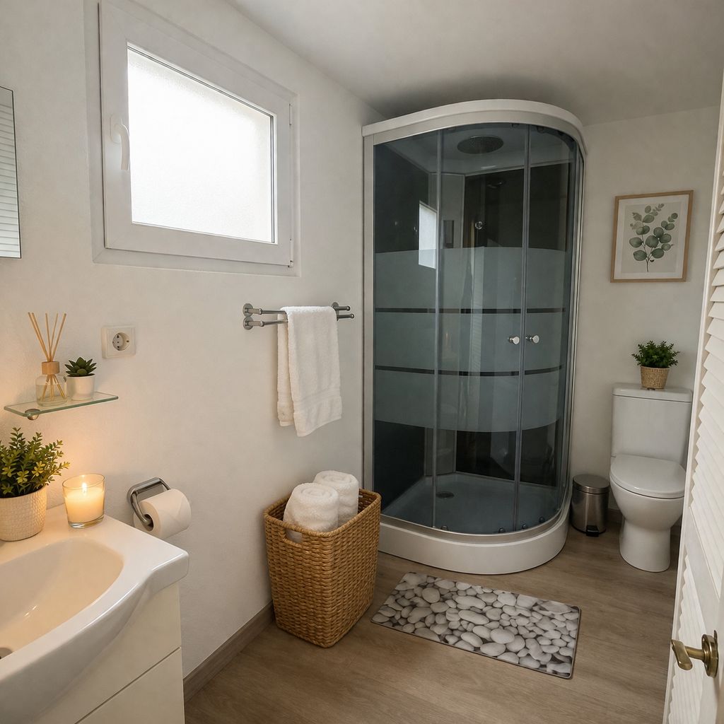 The modern bathroom is bright, well-maintained and designed with great attention to detail. The spacious shower with glass doors ensures a pleasant showering experience and offers plenty of space to relax.